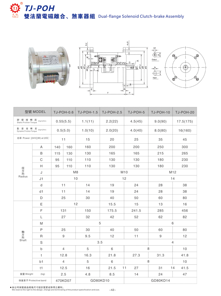 臺灣天機傳動雙法蘭電磁離合剎車器電機組合由TJ-POH立式雙法蘭電磁離合剎車組與三相電動機組合,適用性強,安裝簡單方便