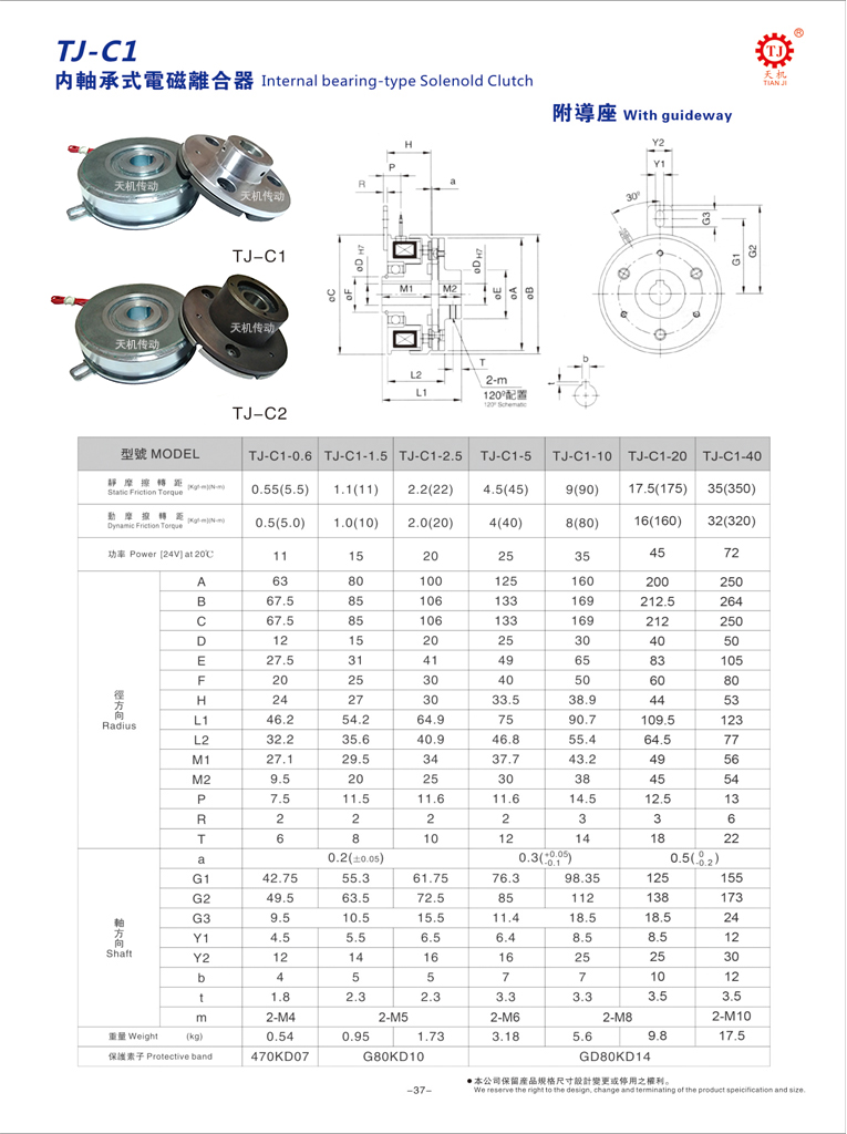 天機傳動軸承安裝型電磁離合器由銜鐵(電樞板)、定子、轉子、板型彈簧片、磁性線圈、來令片、軸承、鋁導座等元件構成,統一使用DC24V,標準規格0.6-40KG。