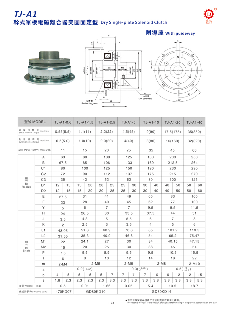 天機傳動正反轉(zhuǎn)電磁離合器(標準電鍍TJ-A1型附鋁導(dǎo)座)由銜鐵(電樞板)、定子、轉(zhuǎn)子、板型彈簧片、磁性線圈、來令片、軸承、鋁導(dǎo)座等元件構(gòu)成,統(tǒng)一使用DC24V,標準規(guī)格0.6-40KG。